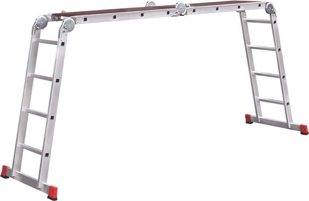 Алюминиевая лестница трансформер Новая Высота 2х3+2х4 обладает повышенной прочностью и надёжностью при небольшом весе, простотой установки и высоким уровенем комфорта. Отличительная особенность таких лестниц-трансформеров - широта возможных позиций, в которых их можно использовать, а также их компактность, что облегчает их перемещение и транспортировку. Регулировка положения лестницы осуществляется с помощью стальных шарниров, которые обеспечивают надежную автоматическую фиксацию выбранного положения лестницы. В целях удобства и безопасности при эксплуатации, лестница оснащена противоскользящими рельефными ступенями.