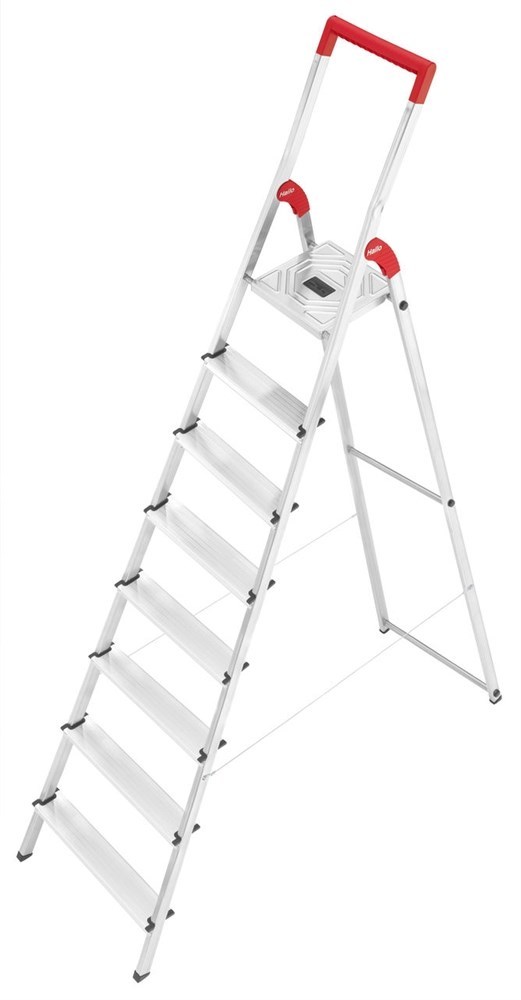 Алюминиевая стремянка Hailo L50 8 ступеней 8150-807 оснащена большой и удобной площадкой с противоскользящим покрытием и высокой дугой безопасности. Фиксатор (крючок) интегрирован в ручку безопасности для удержания банки с краской, ведро с водой, например при чистке окон или для инструментов. Это делает руки свободными, а значит Вы в безопасности - на большой платформе, которая обладает противоскользящим эффектом! Широкие, глубокие алюминиевые ступени с нескользящей поверхностью, шириной 8 см. Съёмные пластиковые противоскользящие ножки. Максимальная грузоподъемность 150 кг.
