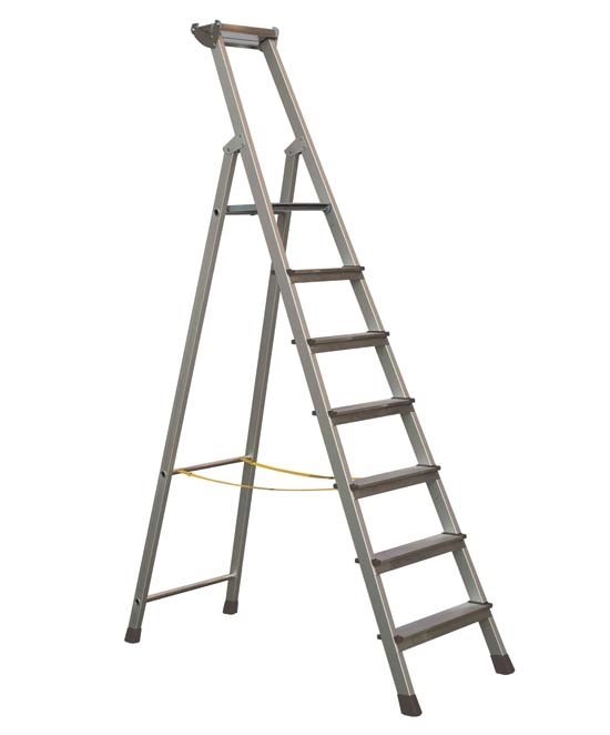 АНАЛОГ Zarges 41227! Алюминиевая стремянка Zarges Z500 7 ступеней 41647 - базовый вариант стоячих лестниц-стремянок со ступеньками в особо легком исполнении и по невысокой цене. Алюминиевые стойки и ступени (естественный цвет). Ступени глубиной 80 мм предотвращают усталость ног при работе. Массивная площадка из литого под давлением алюминия (250 мм x 250 мм). Вместительный алюминиевый лоток для инструмента и материалов. Соединение „ступень-стойка“ тройной клепкой. Противоскользящие пластиковые башмаки. Ступени и стойки из прессованного алюминиевого профиля. Прочные перлоновые стяжные ремни. Габаритная ширина, внизу (м) - 0,53. Высота стойки лестничной/опорной частей (мм) - 48/42.