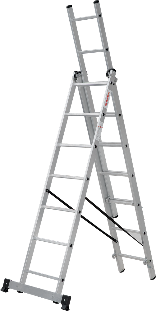 Алюминиевая трехсекционная лестница Новая Высота NV 223 3х5 2230305 может использоваться как приставная лестница, приставная выдвижная лестница, стремянка, стремянка с выдвинутой секцией и функция лестничных пролетов.