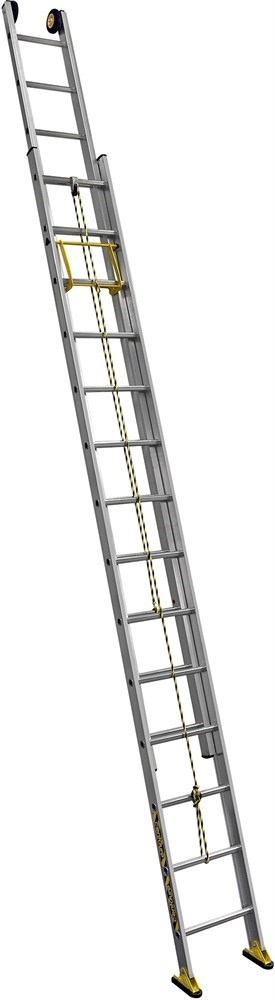 Алюминиевая выдвижная лестница Centaure C2 NEW с тросом 2х16 414416 - комфортабельная лестница для работы на больших высотах. Специально сделанные ступеньки с наклоном обеспечивают удобное положение ступени при использовании. Уникальная надежная система стального замка-коромысла с двойным рычагом. Автоматическая блокировка под действием силы тяжести. Испытана на нагрузку в 400 кг. Шарнирные башмаки, подошва снабжены индикатором износа. Простое использование благодаря кольцевому сердечнику. Встроенная система ползунков по всей длине профиля гарантирует оптимальную установку в рабочее положение и прочность лестницы при максимальном выдвижении секций. Направляющие из алюминия, рассчитанные на интенсивное ежедневное использование. Алюминиевые нескользящие ступени 28 х 25.5 мм. Расстояние между ступенями 280 мм. Надёжное крепление ступеней к направляющим путём тройного зажима и фальцевания. Ролик из алюминиевого сплава, диаметром 125 мм; не оставляют следов на опорных поверхностях.