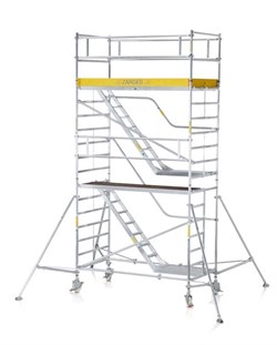 Алюминиевая вышка-тура Zarges Z600 12,35м 53004, с консолями и наклонным подъемом. Удобный подъём и спуск благодаря широким лестницам, устойчивость даже при большой рабочей высоте.