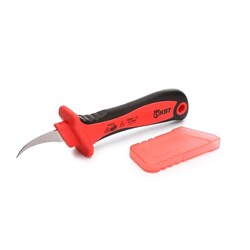 Изолированный нож КВТ НМИ-03 - диэлектрический монтерский нож с изогнутым лезвием для работ под напряжением до 1000 В. Изогнутое лезвие из японской нержавеющей стали. Изолированная рукоятка с упором для пальцев. Двухкомпонентная рукоятка из нескользящей термопластрезины. Защитный чехол для безопасного хранения и транспортировки. Зачистка жил от окисной пленки, снятие оболочки и изоляции кабеля.