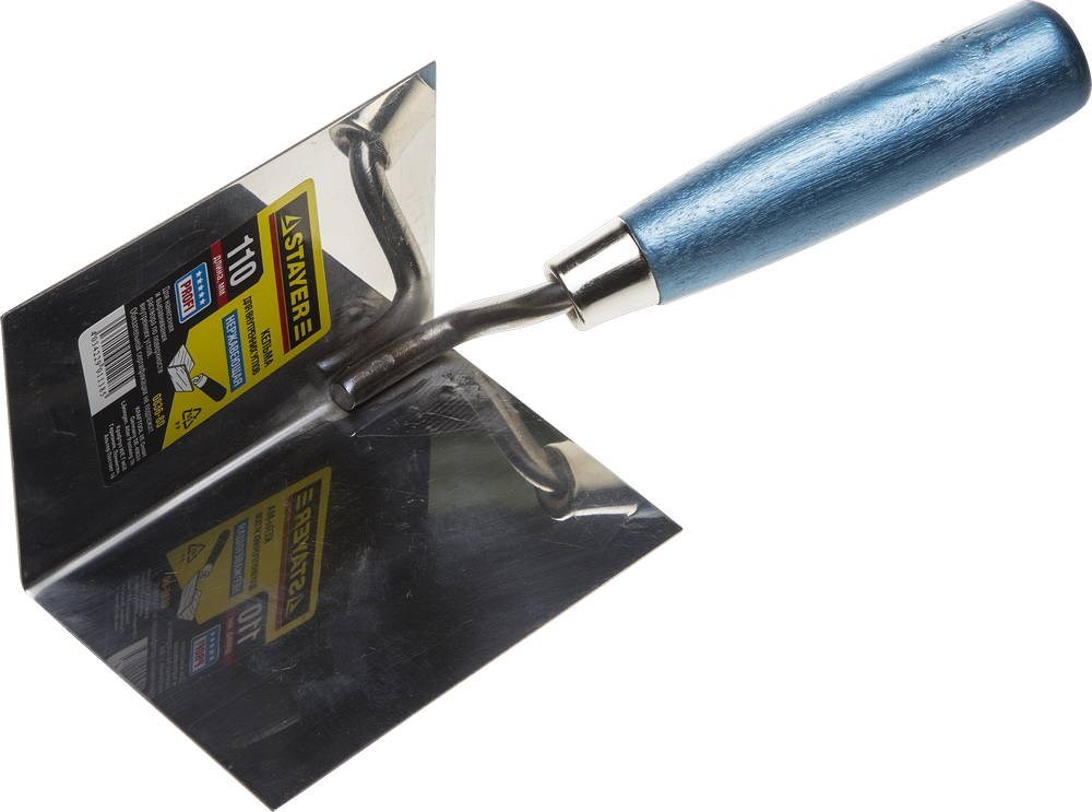 Кельма Stayer "PROFI" внешний угол, 110мм 0836-80 предназначена для отмеривания материалов, перемешивания растворов, нанесения на обрабатываемую поверхность штукатурно-отделочных составов, кладки кирпича. Полотно из нержавеющей стали. Деревянная окрашенная рукоятка.Характеристики