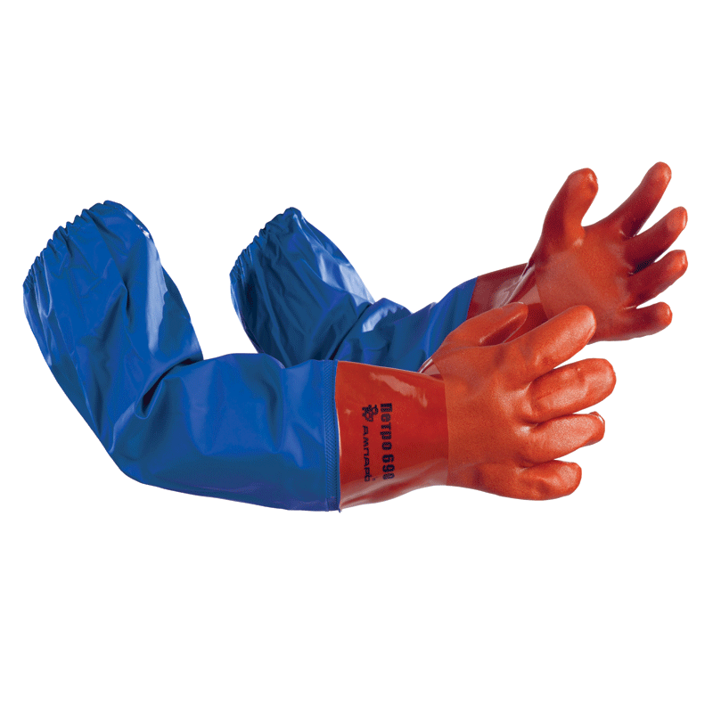 Химостойкие перчатки с нарукавниками Петро 690 Ампаро 436690 - длинные перчатки совмещенные с нарукавником для работы со скользскими поверхностями. Устойчивы к воздействию нефти, технических масел, растворов кислот (до 50%) и щелочей (до 20%).