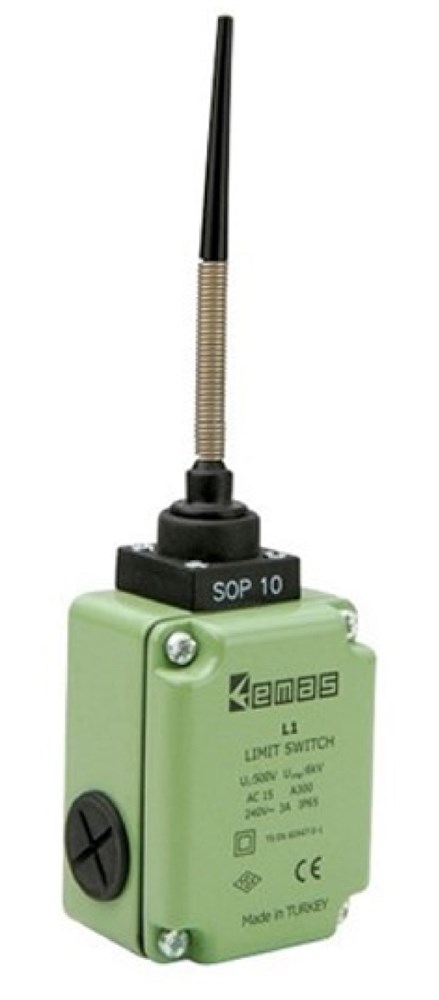 Концевой выключатель EMAS L1K13SOP101 быстрого переключения, многонаправленный с пластмассовой консолью, стальной пружиной, пластиковый наконечник (1НО+1НЗ) предназначен для коммутации электрических цепей управления переменного и постоянного тока под воздействием управляющих упоров в определенных точках пути контролируемого объекта.