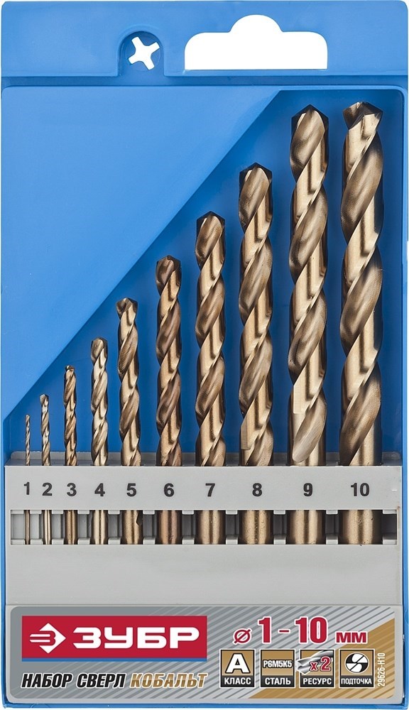 Набор сверл по металлу Зубр Эксперт Кобальт 1-10мм 29626-H10 содержит качественные и точные сверла с большим ресурсом. Сверла изготовлены методом шлифования профиля по ГОСТ 10902-77 и соответствуют классу точности сверления "А1".