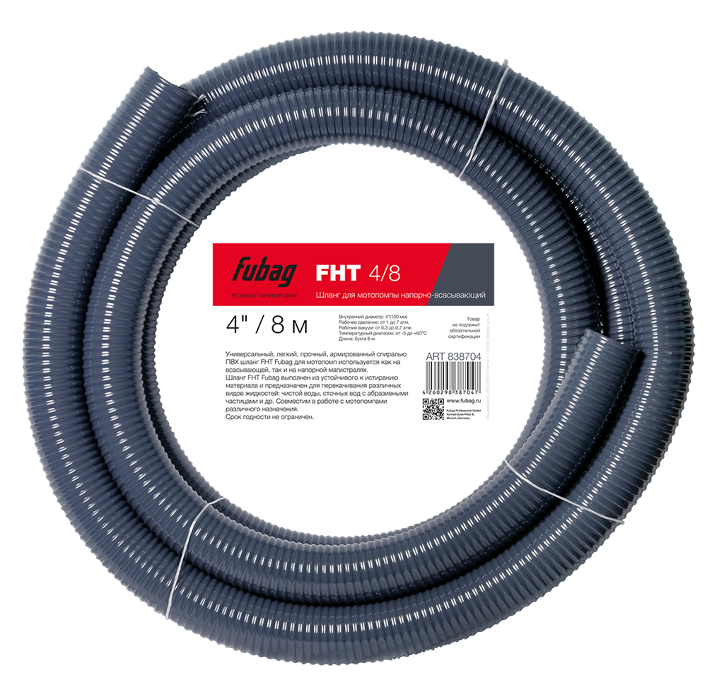 Напорно-всасывающий шланг Fubag для мотопомпы FHT 4/8 - универсальный, легкий, прочный, армированный спиралью ПВХ, используется как на всасывающей, так и на напорной магистралях. Шланг выполнен из устойчивого к истиранию материала и предназначен для перекачивания различных видов жидкостей: чистой воды, сточных вод с абразивными частицами и др. Совместим в работе с мотопомпами различного назначения. Подходит для перекачки воды различного предназначения.Особенности: