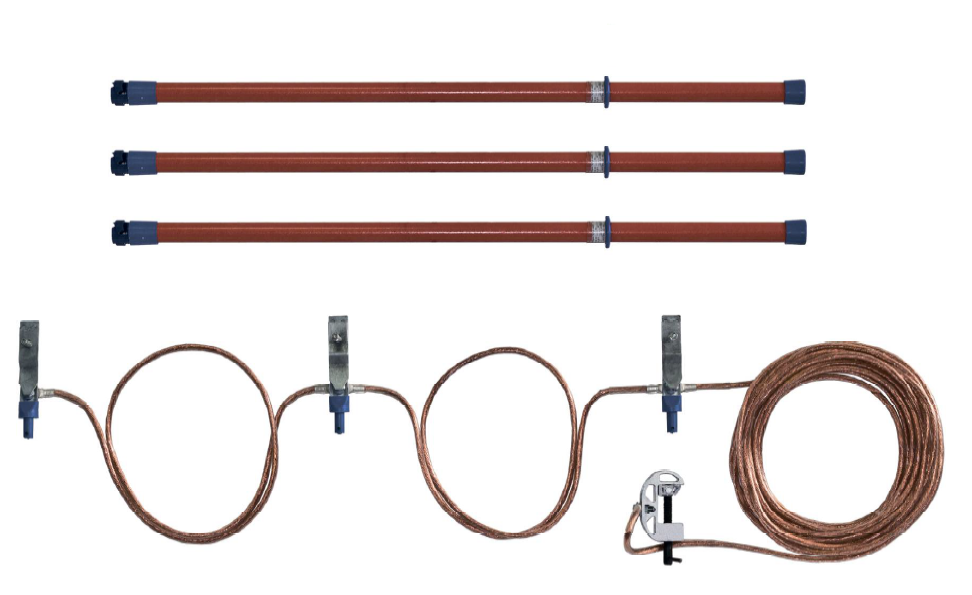- В состав изделия входит: медный провод высокого класса гибкости в прозрачной полиуретановой изоляции, три фазных зажима, три штанги из стеклопластика и струбцина для присоединения к элементам металлической опоры или к заземляющему контуру.