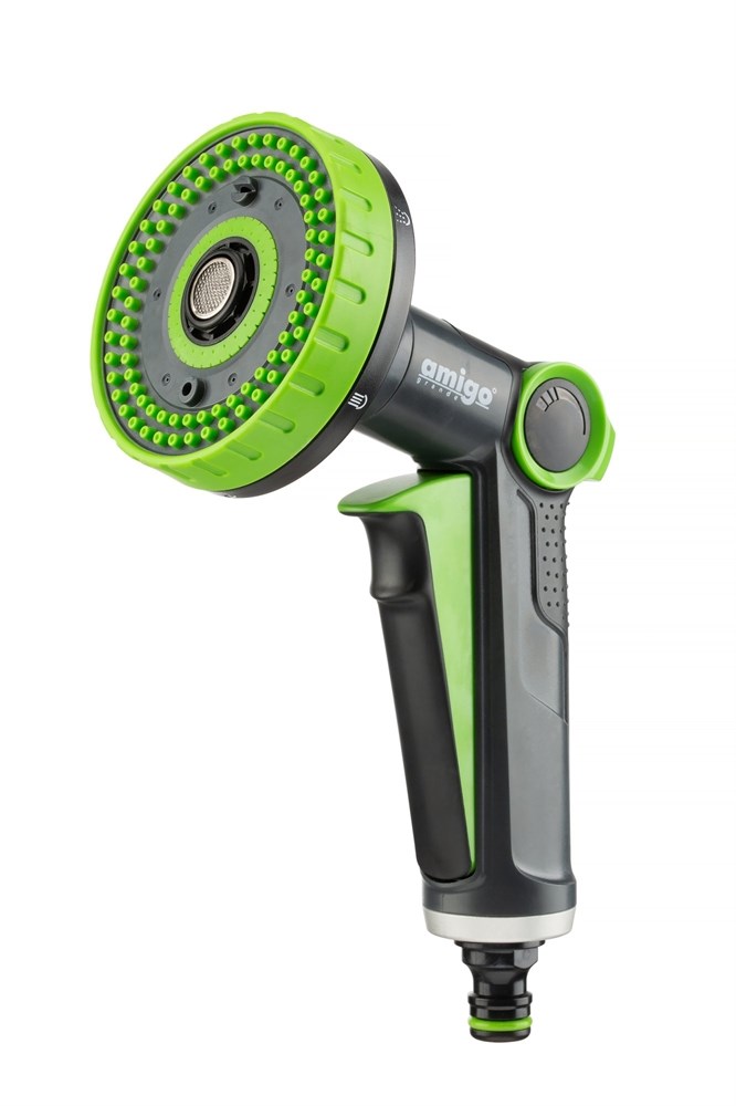 Пистолет-распылитель Amigo 79841 6 режимов предназначен для ухода за садовыми растениями и оснащён шестью режимами распыления. Устройство обеспечивает точный и разнообразный полив благодаря режимам от жёсткой струи до конических струй, с системой click-фиксации и яркой маркировкой для лёгкого выбора. Регулировка напора воды и фиксатор клавиши управления позволяют комфортно использовать инструмент даже при длительном поливе.