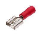 Плоский изолированный разъем КВТ РПИ-М 1.5-(2.8) (мама) изготовлен по ТУ 3424-001-59861269-2004. Предназначен для монтажа быстроразъемных соединений многопроволочных гибких медных проводов методом опрессовки. Материал изоляции: самозатухающий ПВХ. Класс V-0 по UL94. Термостойкость изоляции: 75 °C. Материал разъема: латунь марки Л63. Покрытие разъема: электролитическое лужение. Максимальное напряжение: 400 В. Особенности конструкции: поперечные засечки на внутренней поверхности трубной части разъемов увеличивают механическую прочность соединения с жилой; каждая клемма имеет отверстие для фиксатора замкового типа для прочного механического соединения с разъемом «папа»; Размер контакта определяется шириной «В» клеммы РПИ-П. Комплементарны разъемам РПИ-П и выходам типа «папа» на клеммах электрических устройств. Опрессовка проводника поверх изолирующей манжеты.