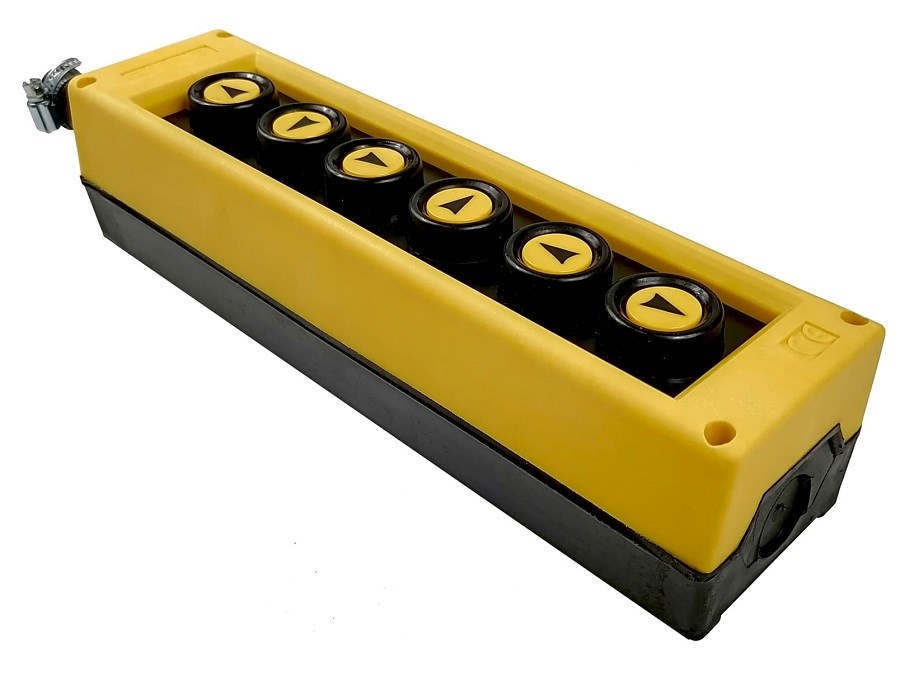 Пульт управления EMAS PVK6E предназначен для управления кранами, кран-балками, тельферами, цепными и канатными талями, мостовыми и козловыми кранами. Может иметь несколько вариантов исполнения: двух, трех, четырех, пяти, шести, семи, восьми, девяти, десяти, одиннадцати и двенадцатикнопочные, включать аварийный останов, аварийный сигнал, сигнал, ключ марку, кнопку (переключатель) вкл / выкл питания, световой фильтр, клавиши увеличения или уменьшения скорости работы двигателя, двух или четырех позиционные джойстики. Изготовлен из высококачественного пластика армированного стекловолокном,
