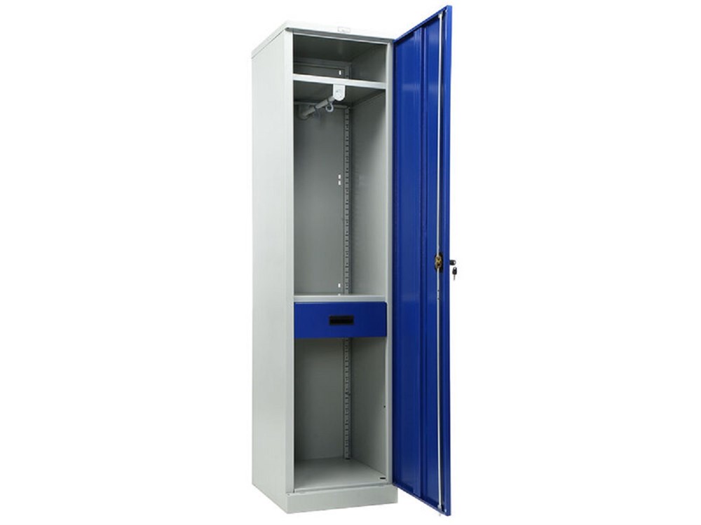 - Покрытие и цвет: порошково-полимерное; корпус — серый полуматовый (RAL 7038), двери — синие (RAL 5002).