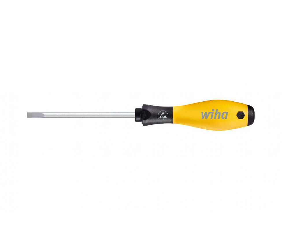 Шлицевая отвертка Wiha SoftFinish 302SF ESD SL 3,0x100 27150 - безопасный в эксплуатации ручной инструмент для монтажа винтов с прямым шлицем. Предназначена для работ с деталями, где требуется отвод электростатического разряда.