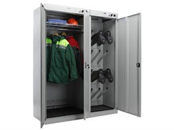 - Шкаф состоит из двух независимых секций. Первая двухдверная для одежды, с перекладиной для вешалок и полкой. Вторая - для сушки обуви, оборудована патрубками для развешивания.
