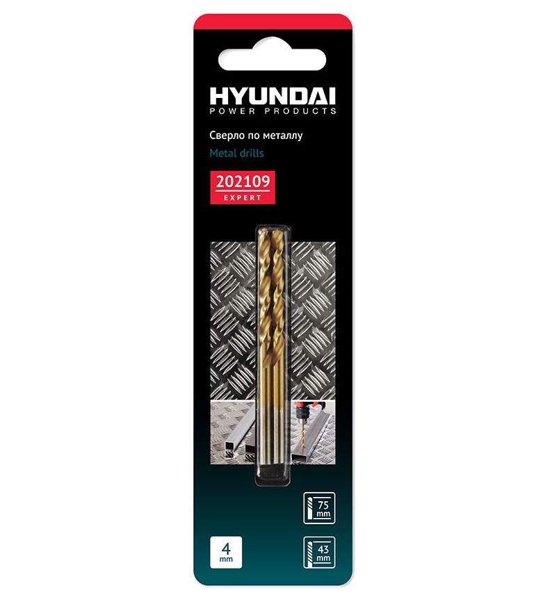 Особенности сверла по металлу 4,0x75/43мм Hyundai 202109:- Набор из двух свёрл для сверления металла (листового и цветного) и стали
