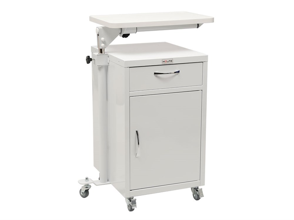 Тумба медицинская HILFE МД ТП-9 S26199404909 — функциональное решение для хранения личных вещей пациентов и медикаментов в больничных палатах или домашних условиях. Комплектуется прикроватным поворотным столиком для удобного приема пищи, чтения или размещения ноутбука. Изготовлена из стали, оснащена поворотной столешницей из ЛДСП с лазерной кромкой, телескопическими направляющими, колесами с стопорами и дополнительной опорой для устойчивости.